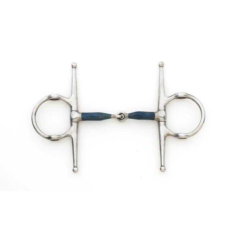 the Jointed Full Cheek Blue Steel Gag Bit is made from Centaur’s technologically advanced version of Black Steel (traditional Sweet Iron). Blue Steel oxidizes faster and easier compared to Black Steel. It will rust when in contact with air and humidity. This surface rust tastes sweet and naturally stimulates additional saliva production, encouraging better acceptance of the bit by the horse.