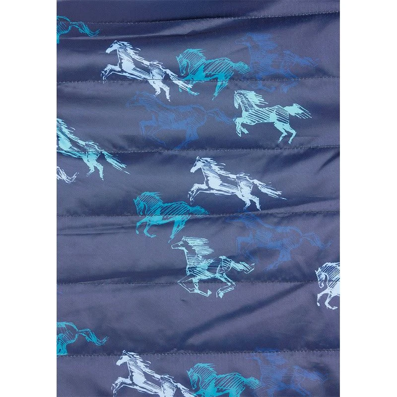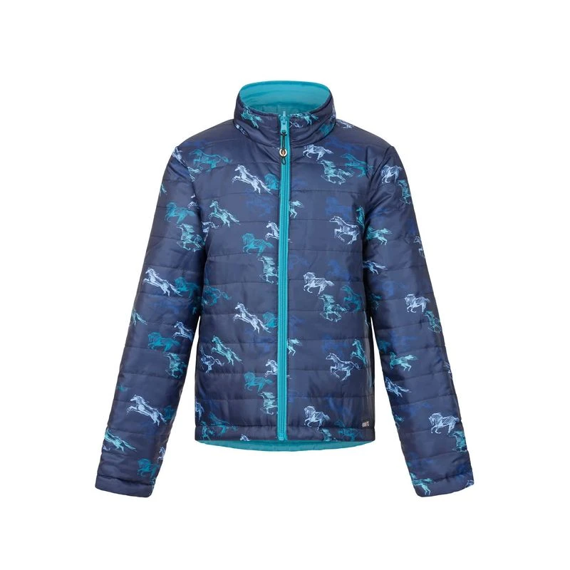 Showing the whole herd or just a few horses, 100-gram of quilted insulation with an equestrian hem keeps kids warm in the saddle and beyond. Tall collar keeps kids warm; variety keeps them happy.