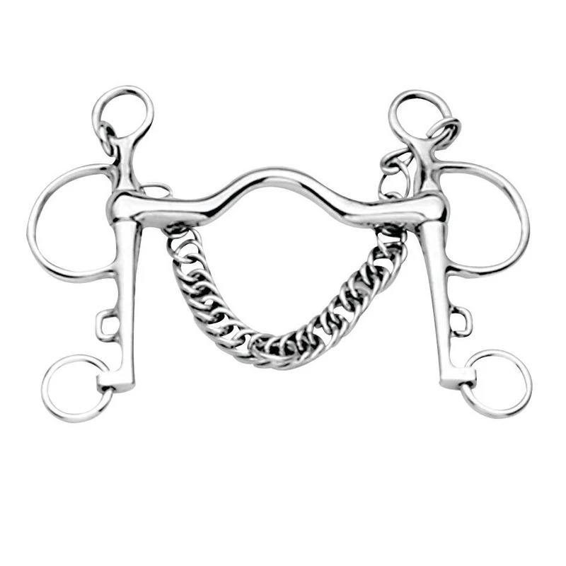 Offering a stronger alternative to snaffle bits, an incorporation of the Weymouth and Bradoon. Can be used with two reins, first reins acting as a snaffle, the second offering poll pressure also adding curb pressure. Can also be used with single reins and roundings. Ported mouthpiece discourages the horse from putting the tongue over the bit. The Pelham is ideal for polo as it allows for the function of a double bridle, but is easier to hold one-handed.