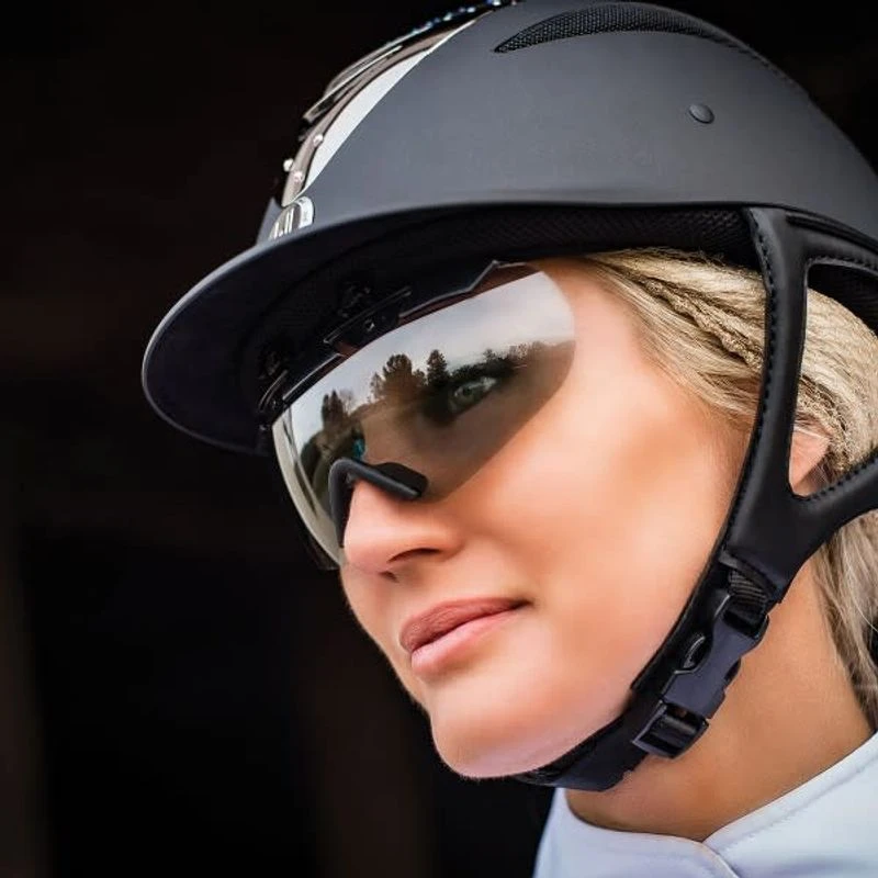 Magnetically-attached click-in sunglasses attach to any “Klick N Go” compatible One K helmet. Comes with a protective zippered case for storage.