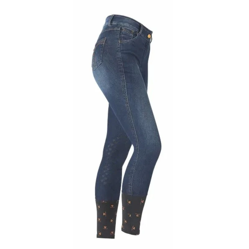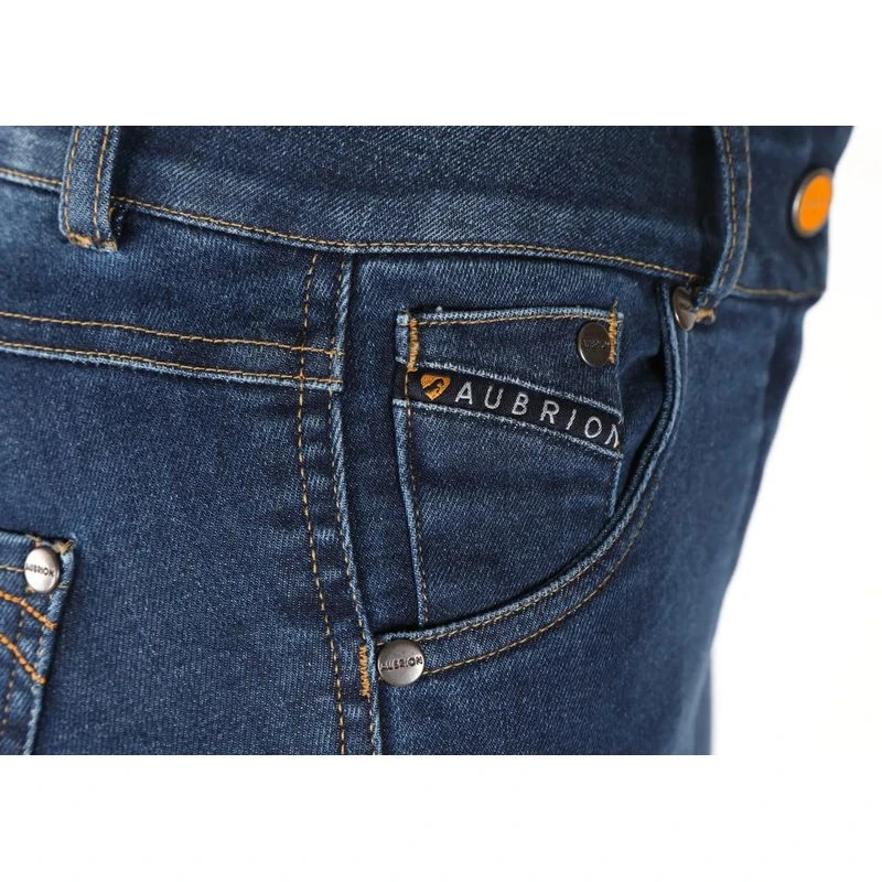 These stretch denim breeches feature: mid-rise, belt loops, jean pocket styling, zip fly with enamel button fastener, matte silicone knee grips, stretch contrast lower leg cuffs, and leather look Aubrion badge.